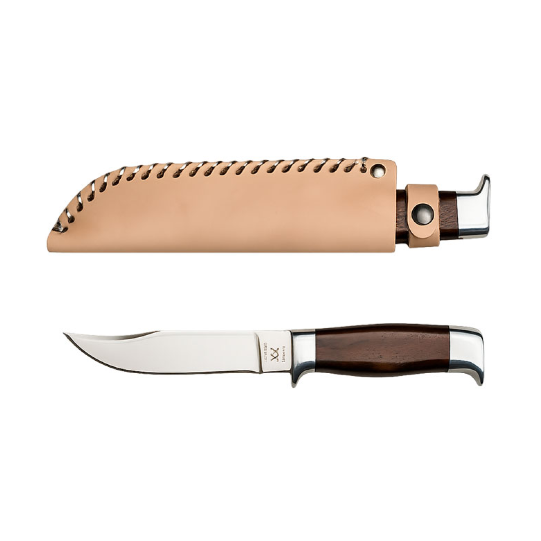 Skaftet er fremstillet i træ, hvilket giver et naturligt og komfortabelt greb. Den medfølgende læderskede med sikringsrem holder kniven sikkert på plads og gør den nem at bære i bæltet under jagt eller friluftsliv. Kombinationen af træskaft og læderskede giver kniven et klassisk og tidløst udtryk.